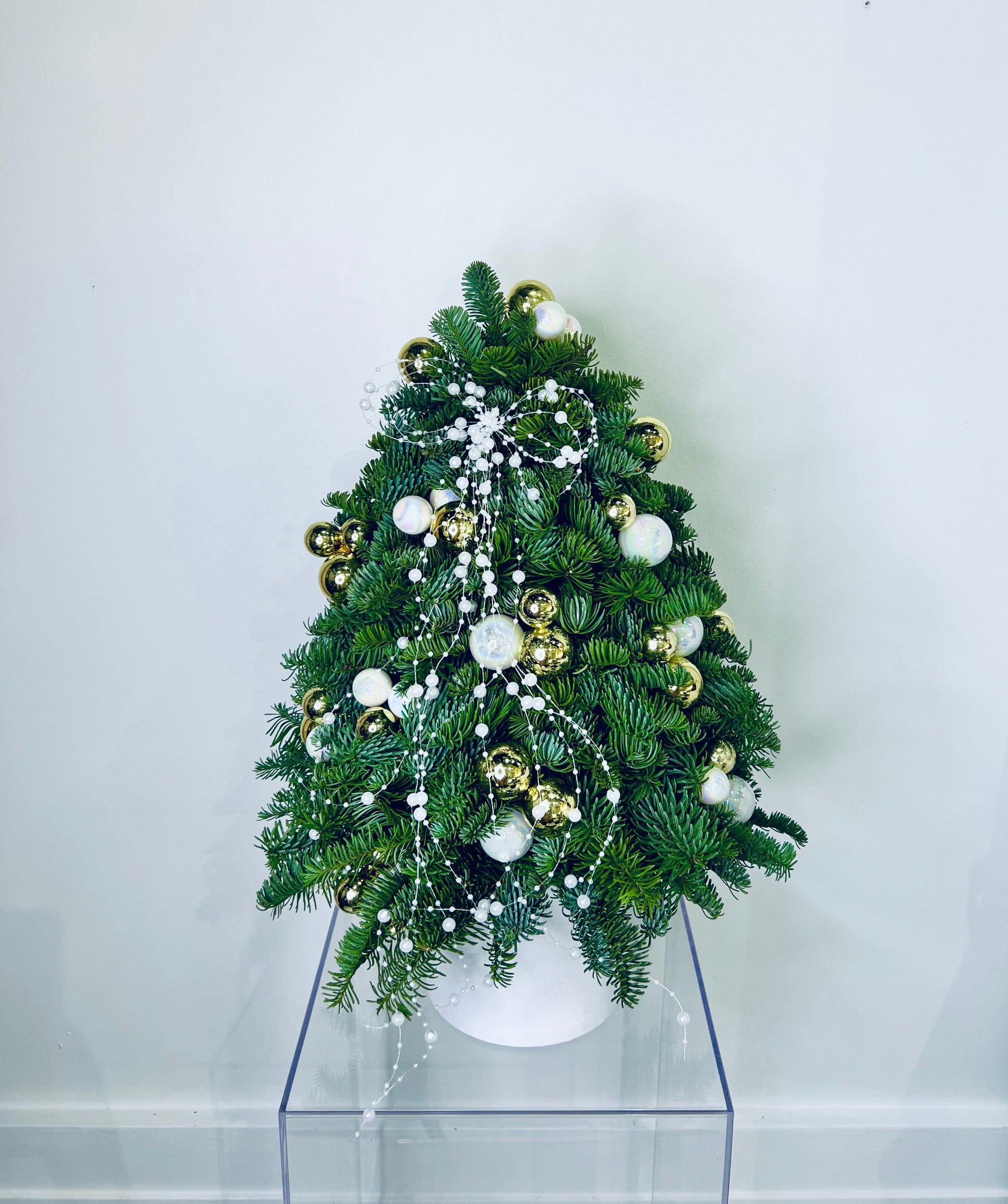 The Winter Gold Pearl Mini Christmas Tree features a soft, elegant winter palette of iridescent white ornaments, gold baubles, and flowing pearl strands. Hand-crafted with premium evergreens, it delivers a clean, modern look perfect for neutral or upscale holiday styling.